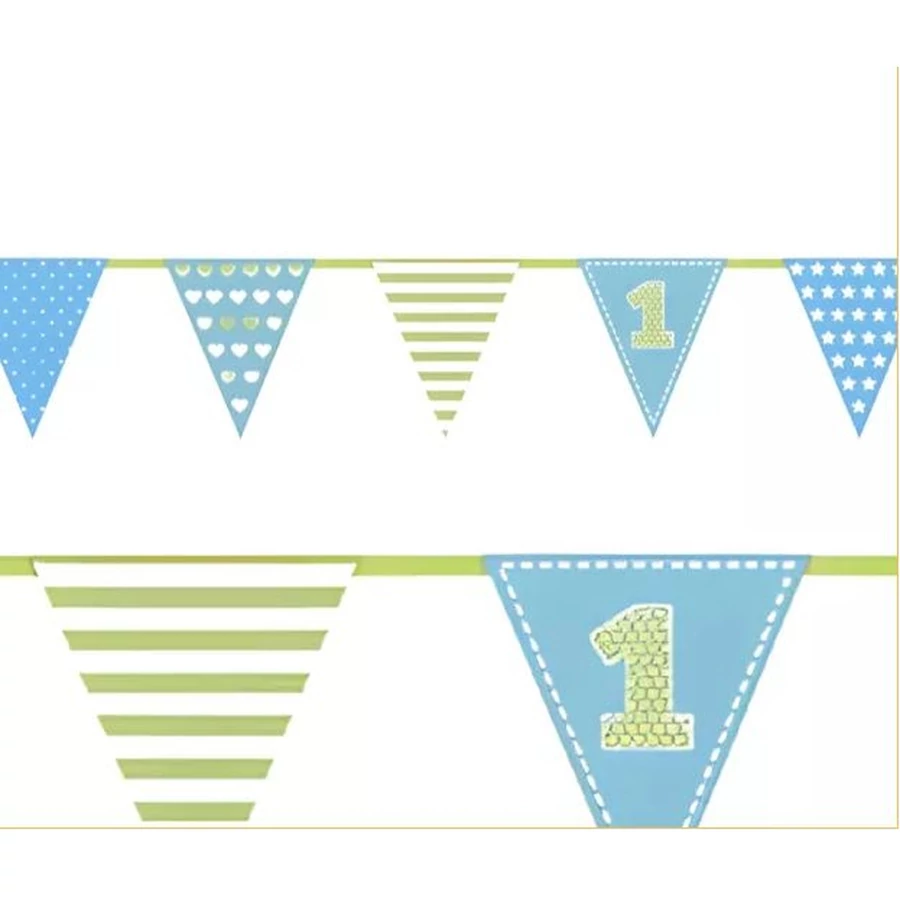 Első születésnapi papír girland, égszínkék és világos zöld, mérete 18 x 135 centiméter.