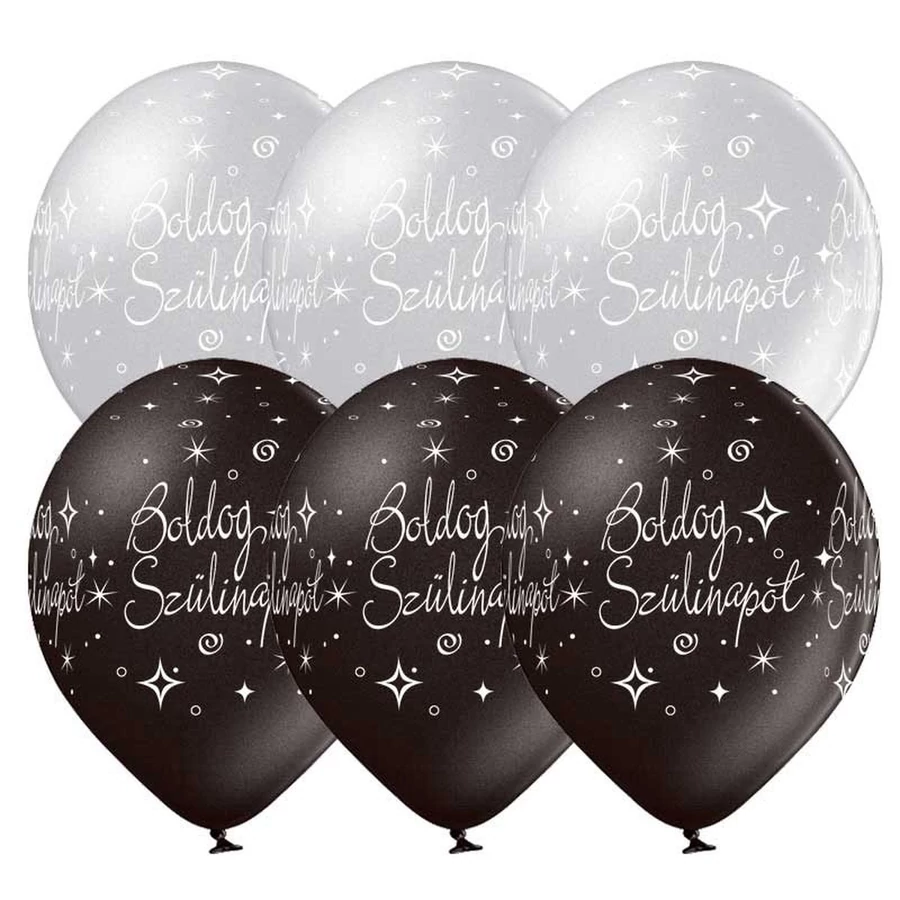 11 inch-es Boldog Szülinapot Silver és Black - Ezüst és Fekete Lufi (6 db/csomag) Héliummal