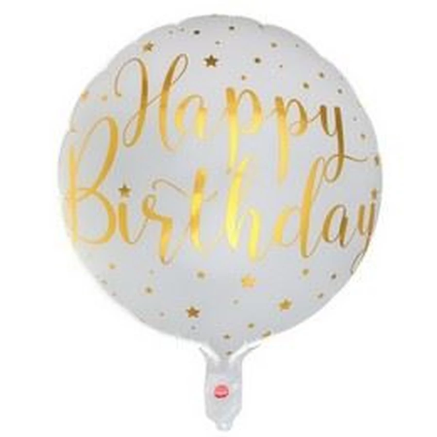 18 inch-es, arany-fehér színű Happy Birthday feliratú, kerek fólia léggömb.