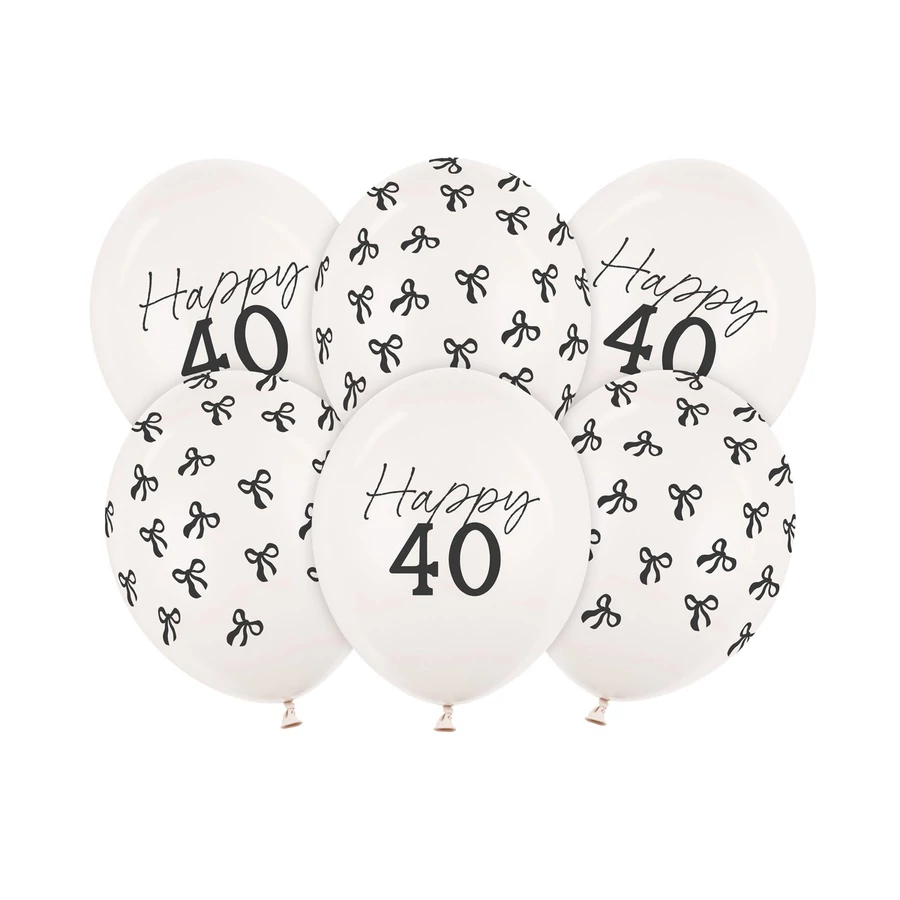 Erős lufik ''40'' felirattal, a készlet 6 színű lufit tartalmaz (pasztell pisztácia, pasztell vadrózsa, pasztell mézsárga, pasztell világoskék, pasztell világoslila és pasztell méz) kétoldalas nyomtatással, átmérője kb. 30 cm. (1 csomag / 6 db.)
