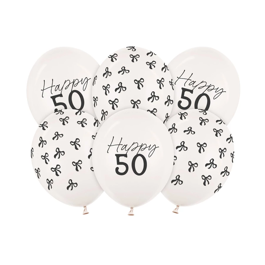 Erős lufik ''50'' felirattal, a készlet 6 színű lufit tartalmaz (pasztell pisztácia, pasztell vadrózsa, pasztell mézsárga, pasztell világoskék, pasztell világoslila és pasztell méz) kétoldalas nyomtatással, átmérője kb. 30 cm. (1 csomag / 6 db.)