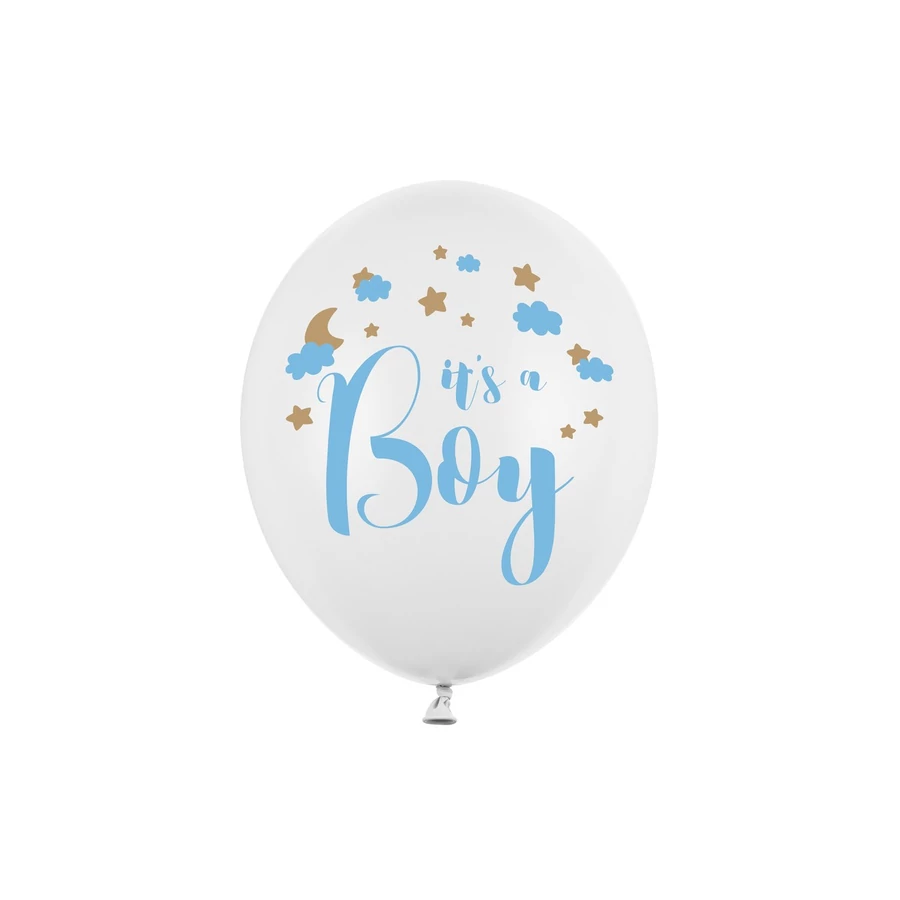 Strong lufik, pasztell tiszta fehér, égkék-arany kétoldalas nyomtatással, "It's a Boy" felirattal, átmérője 30 cm. (1 csomag / 6 db)