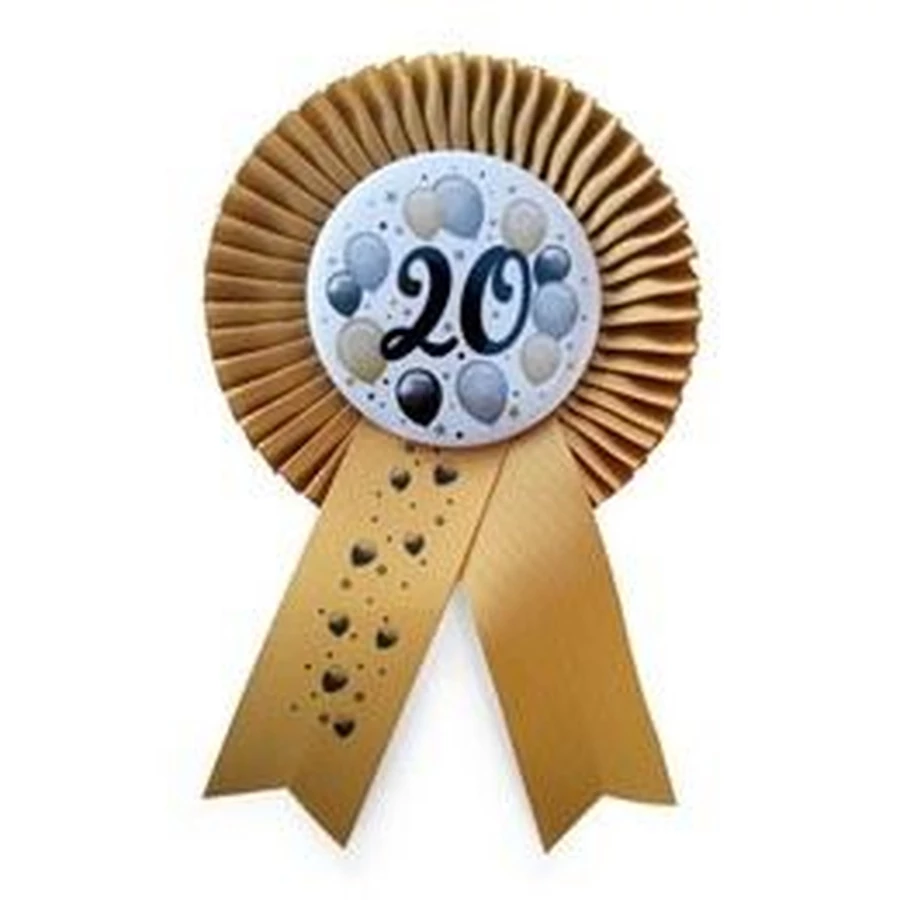 Elegáns, 20-as, szalagos, számos szülinapi kitűző az ünnepeltnek.