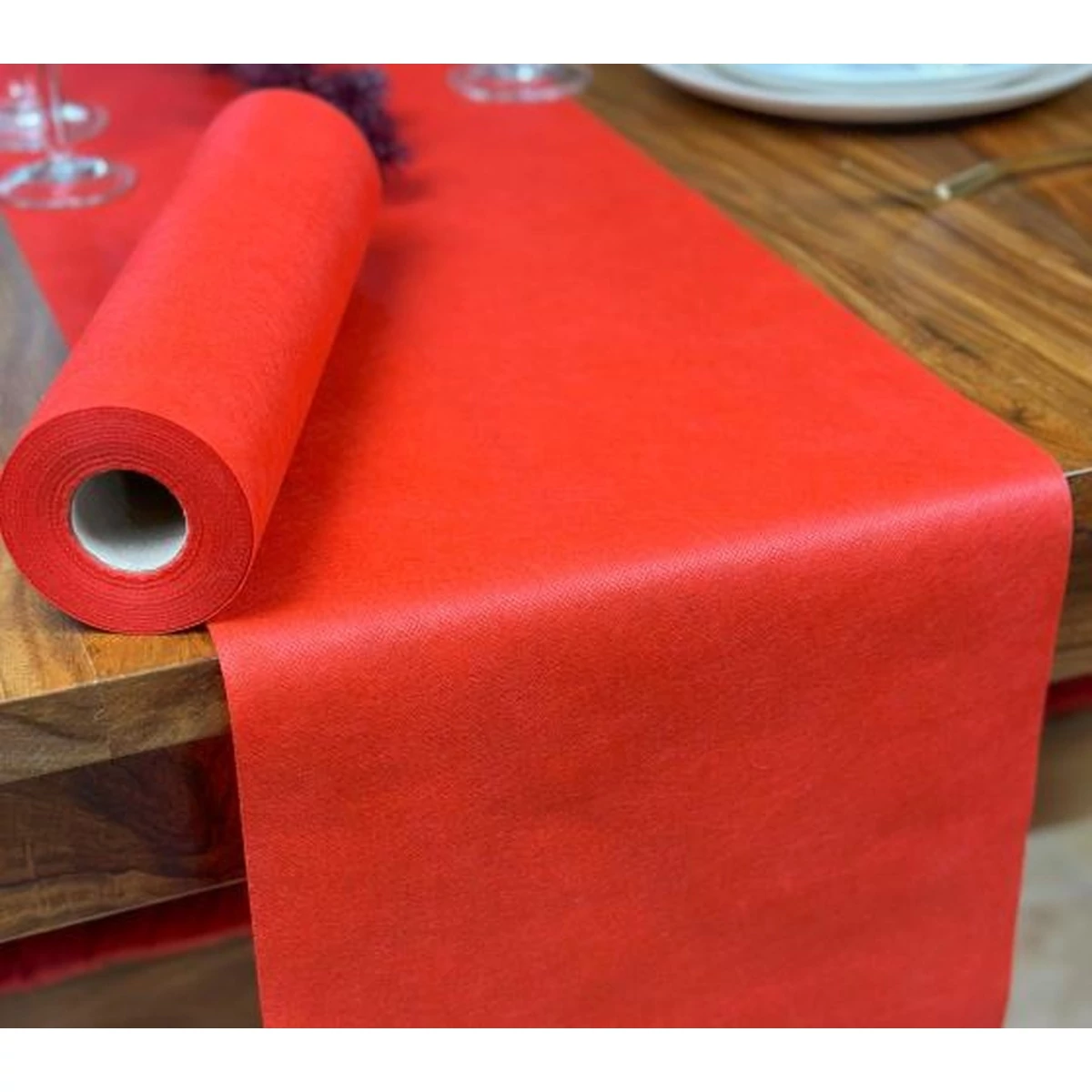 5 méter x 1,2 méter-es gyapjú anyagú, piros színű terítő.