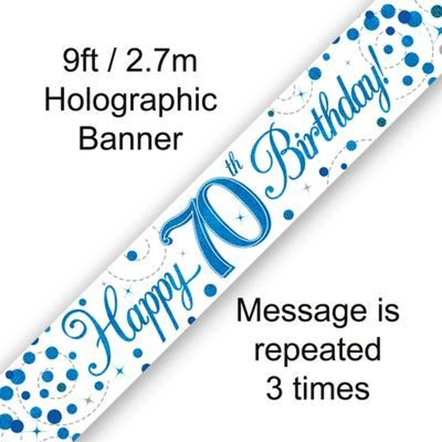 Banner - Happy 70th Birthday! - felirattal, fehér-kék hologramos színben.
