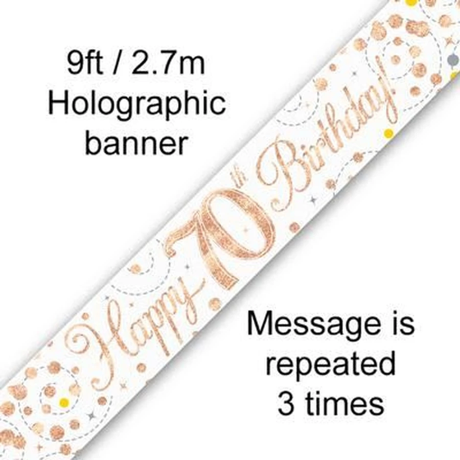 Happy 70th Birthday banner – fehér/rosegold, 2,7 m (holografikus hatás)