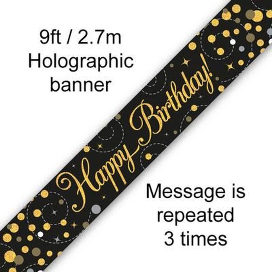 Banner - happy birthday fekete, arany hologramos felirat 2,7 méter
