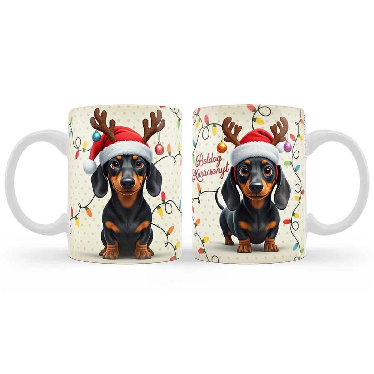 Ha szeretteid imádják a kutyusokat, különösen a tacskókat, akkor ez a Boldog Karácsonyt feliratú bögre tökéletes választás számukra az ünnepi szezonra! Egy cuki tacskó díszíti a bögrét, aki karácsonyi sapkát és rénszarvas aga