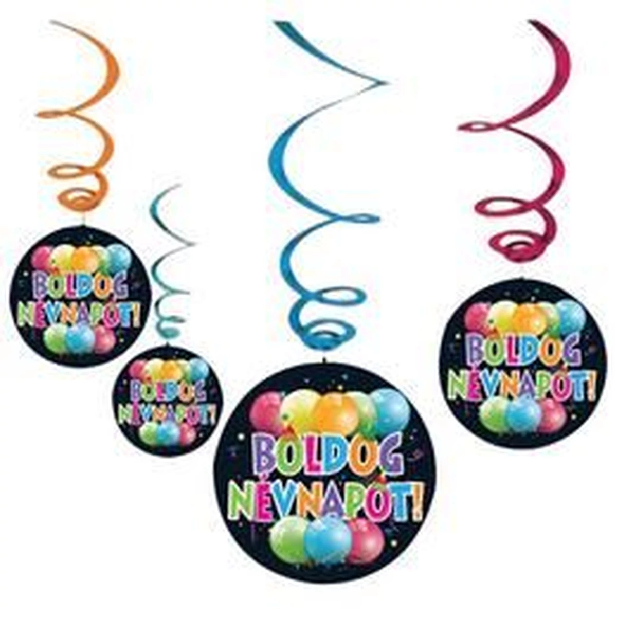 Színes, Boldog Névnapot Feliratos Karton dekoráció sárga, rózsaszín, sötétkék, piros, világoskék és zöld spirálon.