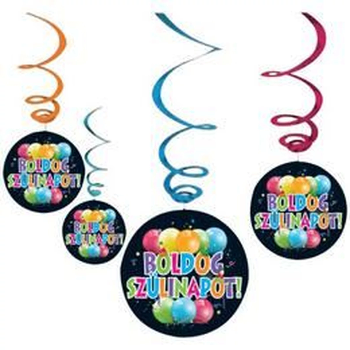 Színes, Boldog Szülinapot Feliratos Karton dekoráció sárga, rózsaszín, sötétkék, piros, világoskék és zöld spirálon.