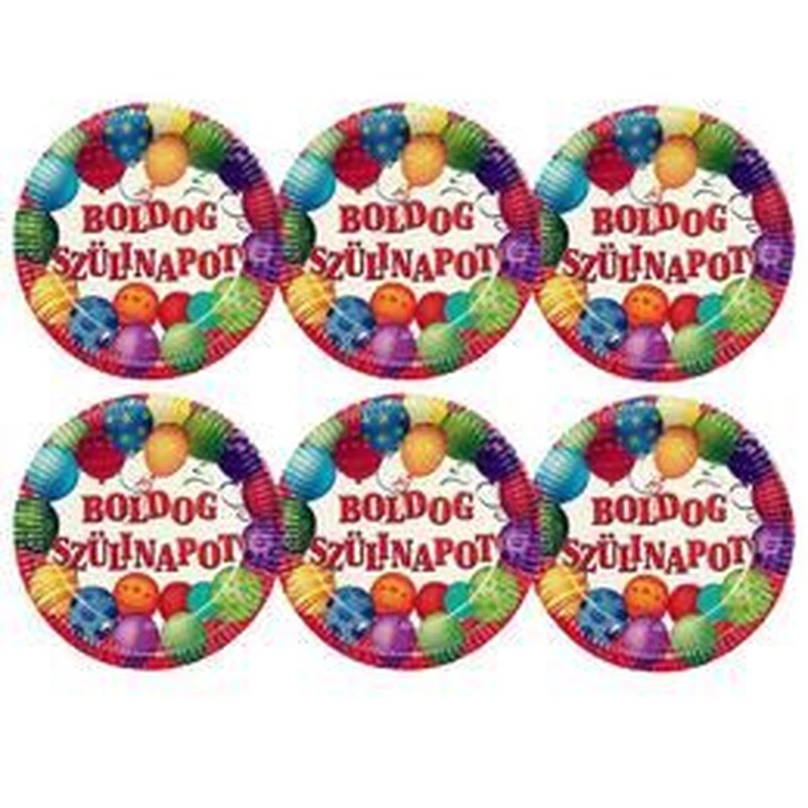 Színes tányér Boldog Szülinapot! felirattal és lufis szülinapi grafikával.