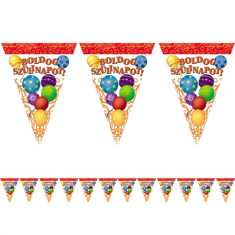 Színes zászlófüzér Boldog Szülinapot! felirattal és lufis szül