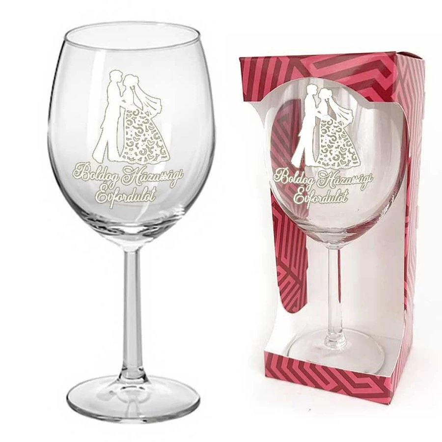 Boldog Házassági Évfordulót feliratú borospohár, esküvői pár motívummal.