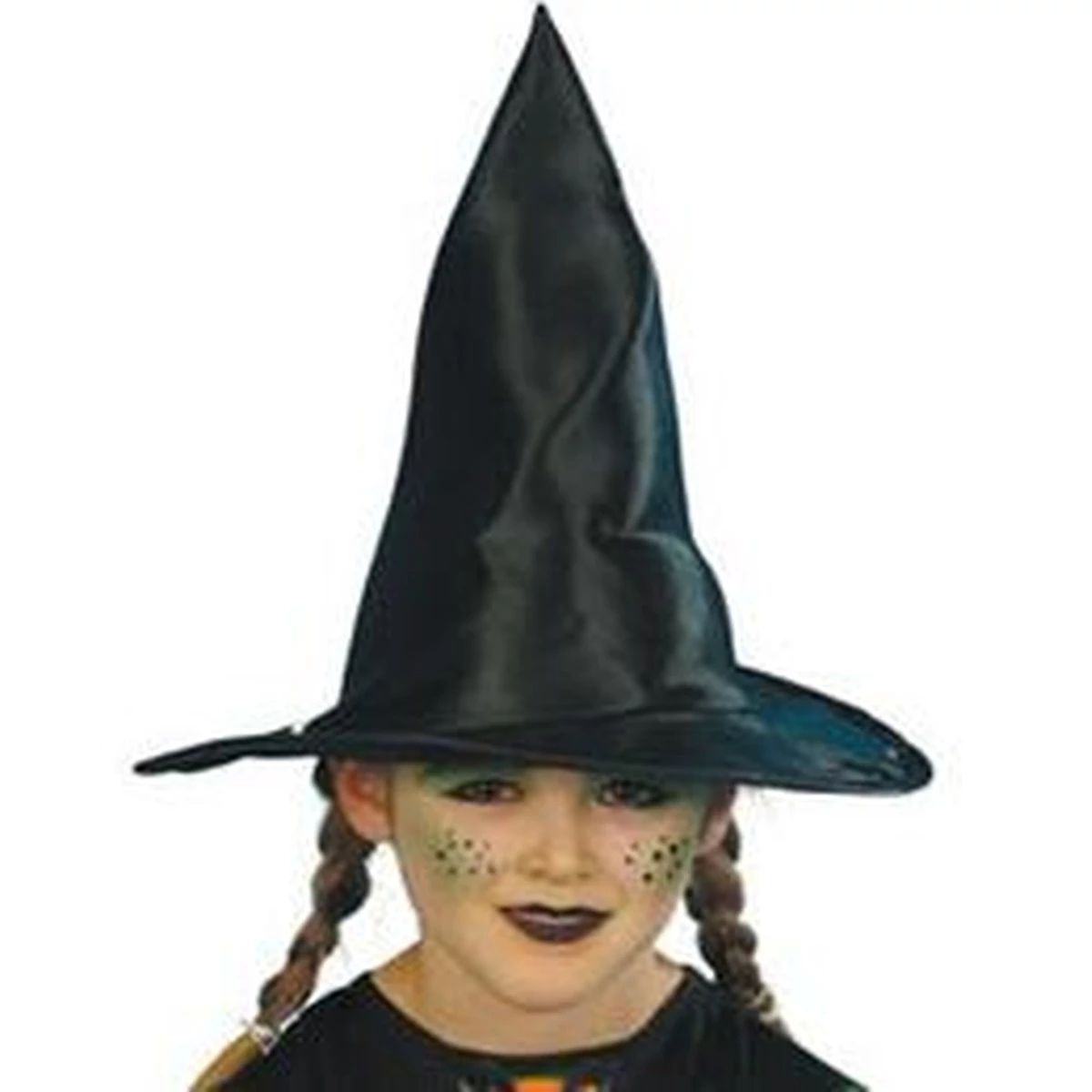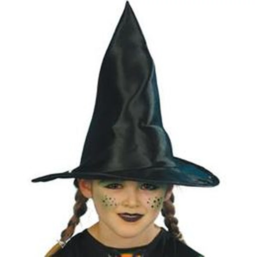 Fekete színű, kúp alakú boszorkány kalap gyerekeknek, könnyű, szellős anyagból.