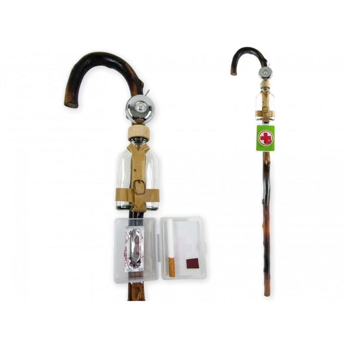 Csengős sétabot elsősegély dobozzal (óvszer, cigarettával) és flaskával.
