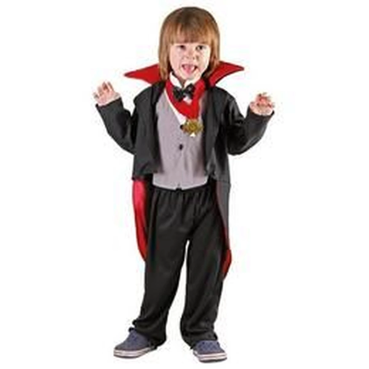 A vámpír jelmez összességében: egy frakkból, egy nadrágból és egy fehér gombos, csokornyakkendős mellényrészből áll össze.