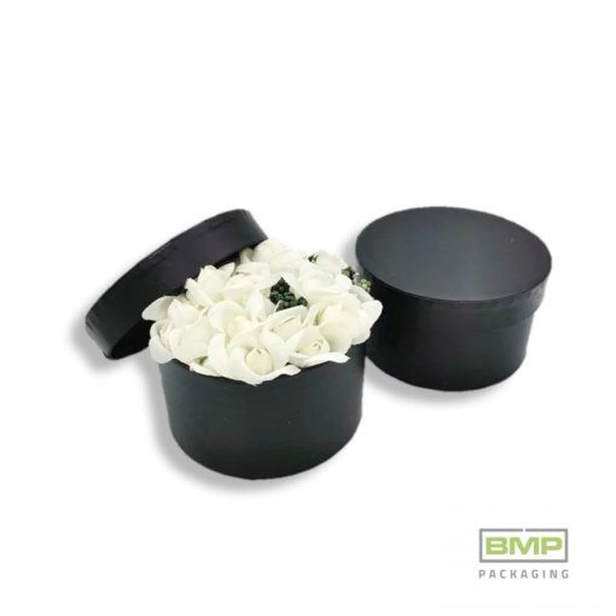 Kerek fekete díszdobozok 10,8 x 6,2cm-es méretben.