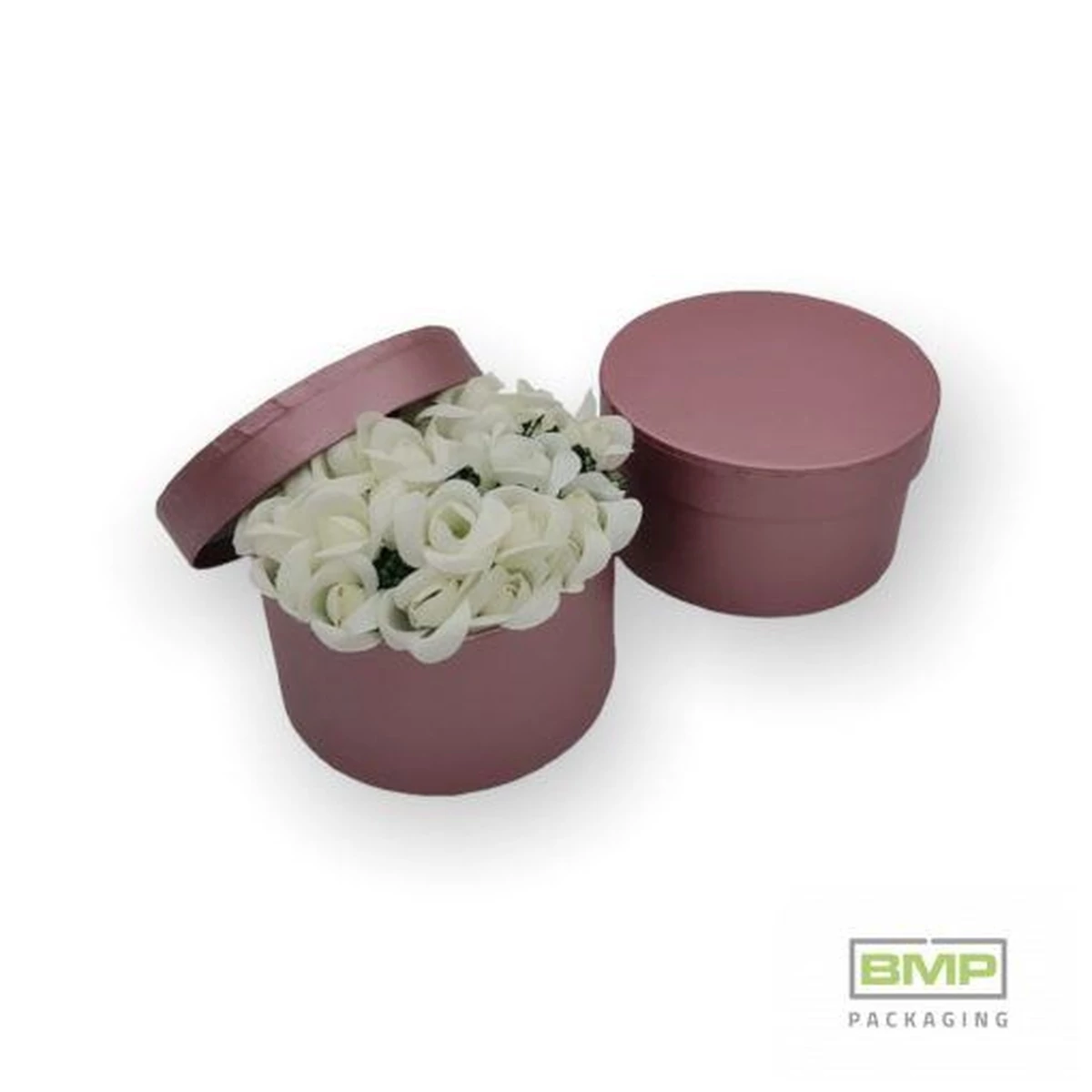 Kerek mályva színű díszdobozok 10,8 x 6,2cm-es méretben.