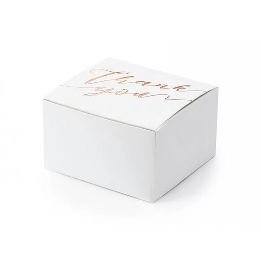 Fehér színű dobozok, rózsaszínű arany metál felirattal Köszönöm, méret kb. 6 x 3,5 x 5,5 cm