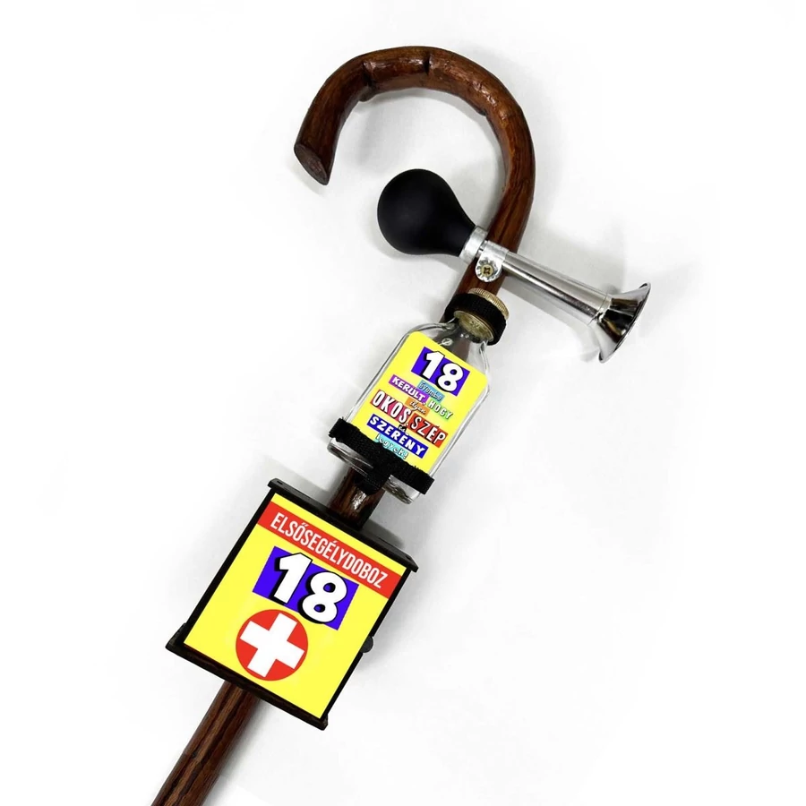 A sétabot részeként tartozik hozzá egy duda, pálinkás laposüveg és egy elsősegély doboz. Az elsősegély doboz tartalma pedig óvszert és cigaretta hüvelyt, fecskendőt foglal magában, ami még humorosabbá teszi az ajándékot.