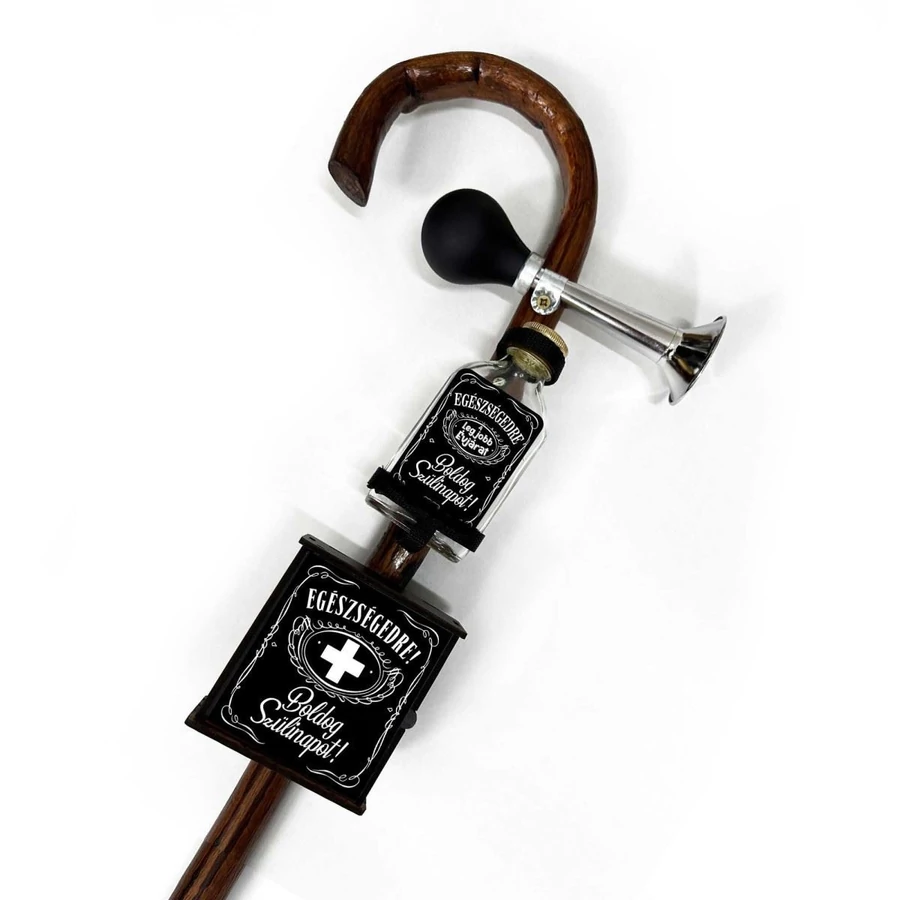 A sétabot részeként tartozik hozzá egy dudás, pálinkás laposüveg és egy elsősegély doboz. Az elsősegély doboz tartalma pedig óvszert és cigaretta hüvelyt, fecskendőt foglal magában, ami még humorosabbá teszi az ajándékot.