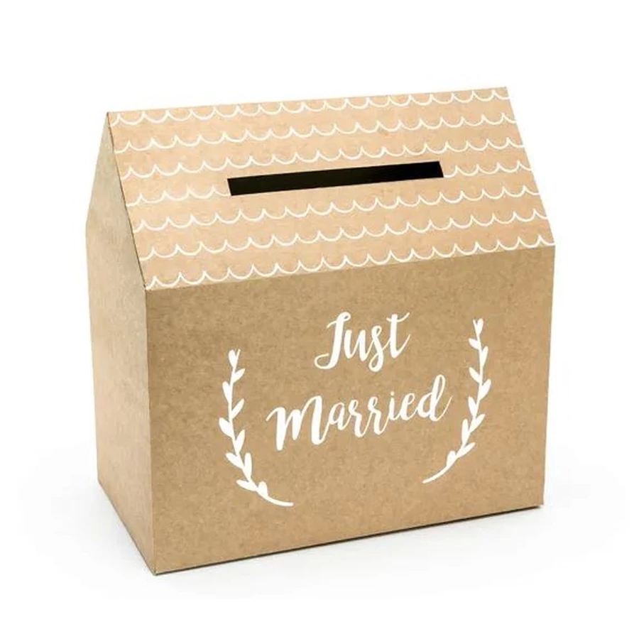 Esküvői jókívánság- / pénzgyűjtő doboz, Just married felirattal, díszítéssel.