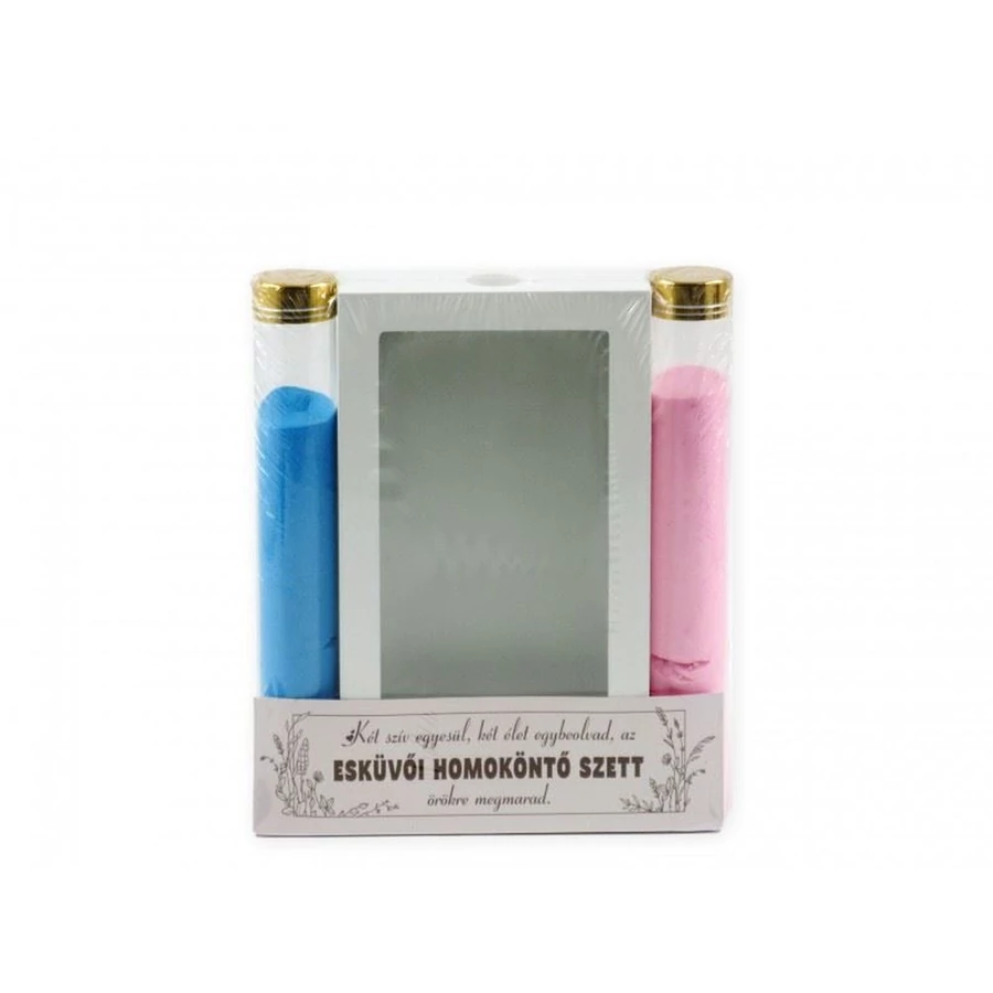 Esküvői homoköntő szett, 2 darab homokot tartalmazó hengerrel és egy fa tartóval.