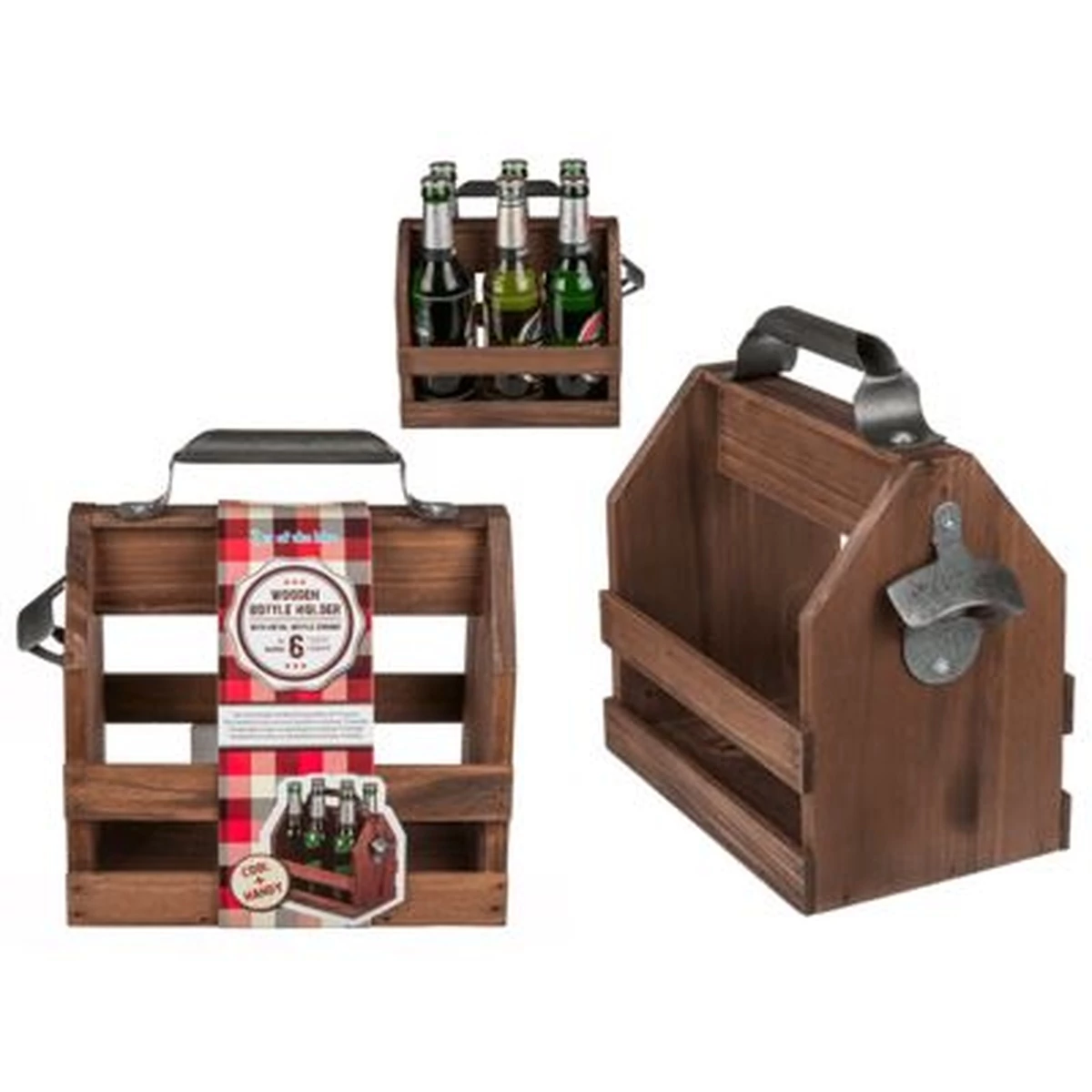Fából készült 6 darab sörösüveg(0,33L) tárolására alkalmas tároló, oldalán 1 darab sörnyítóval.