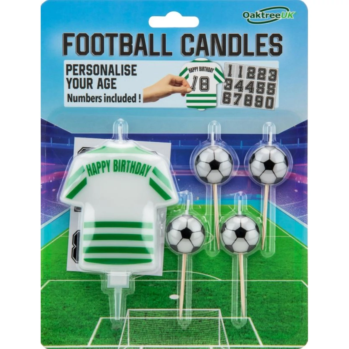 Számozható, zöld-fehér mezes gyertya szett focistáknak.
