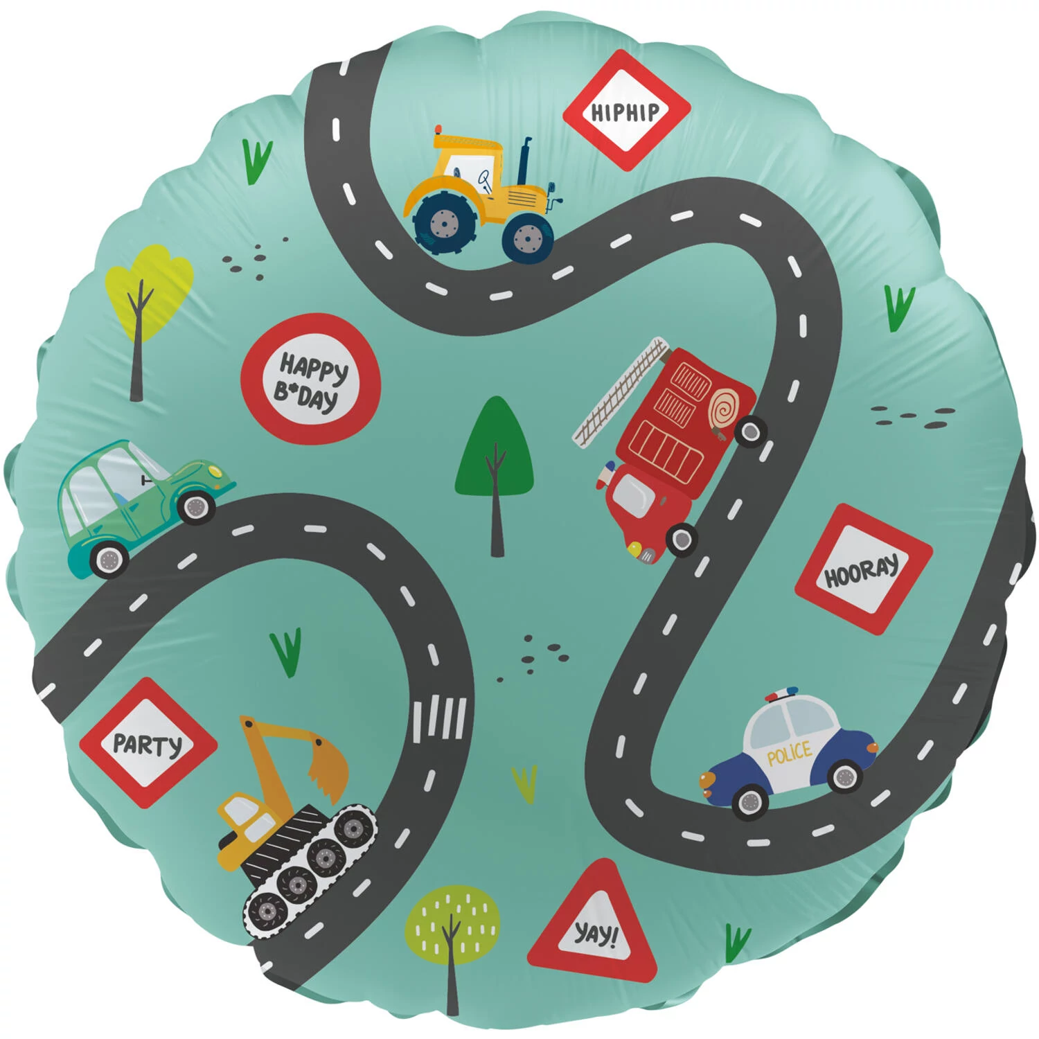 Egy vidám fólia lufi egy kanyargós úttal, amelyen egy kotrógép, egy autó, tűzoltóautó, egy rendőrautó és egy traktor halad.