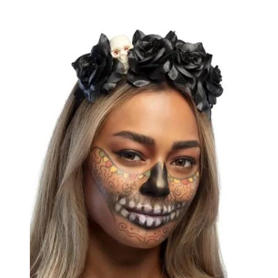 Hajpánt fekete virágokkal és koponyával díszítve.