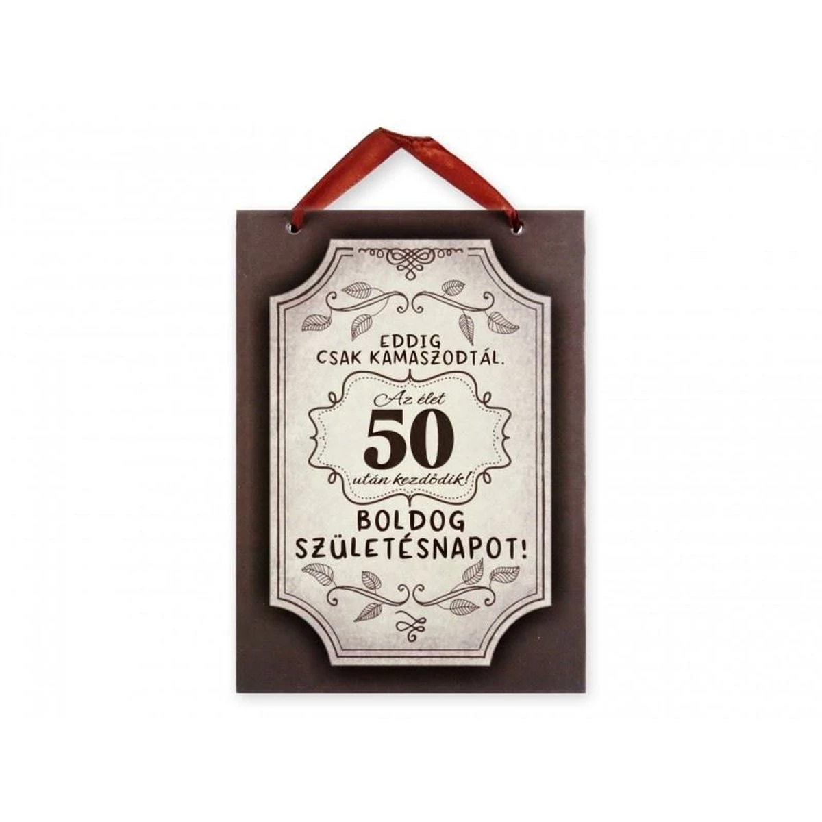 Kis fa tábla 50. születésnapra. Eddig csak kamaszodtál, az élet 50 után kezdődik! Boldog Születésnapot! felirattal.