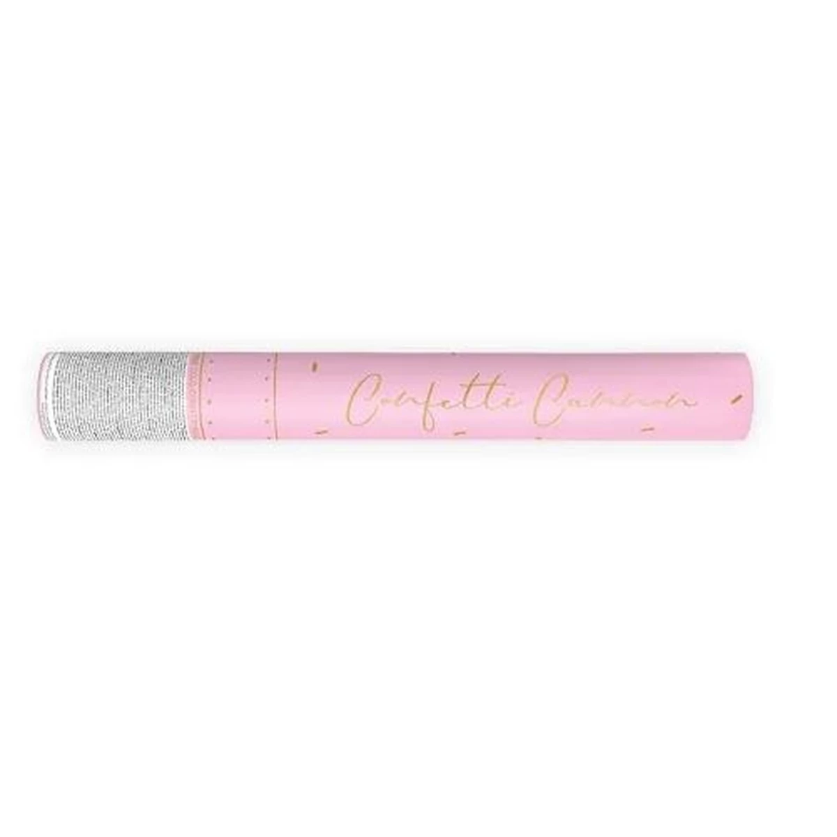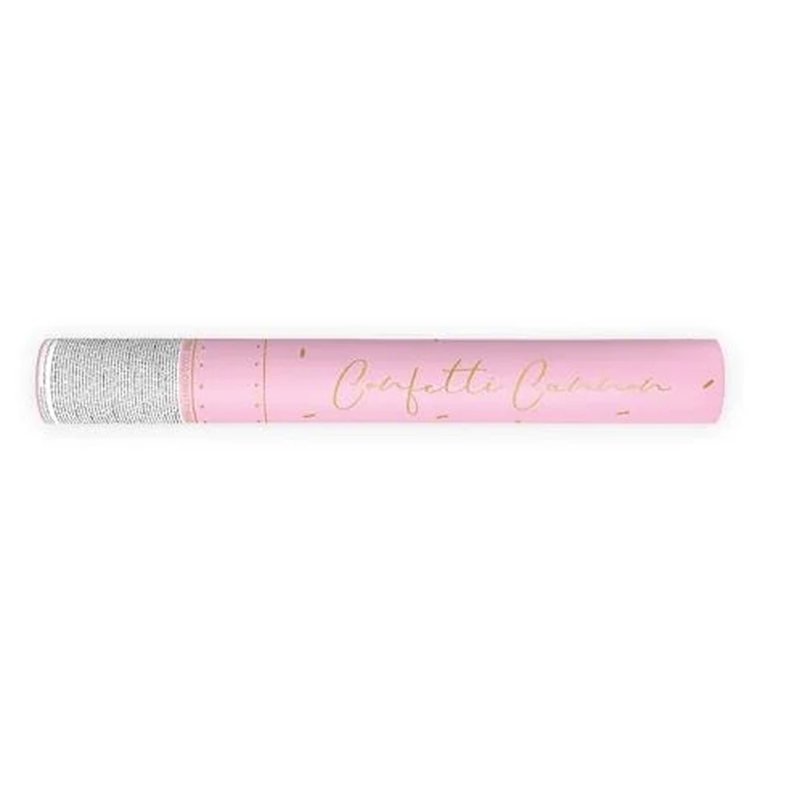 Rózsaszín dobozban lévő arany konfetit kilövő konfettiágyú