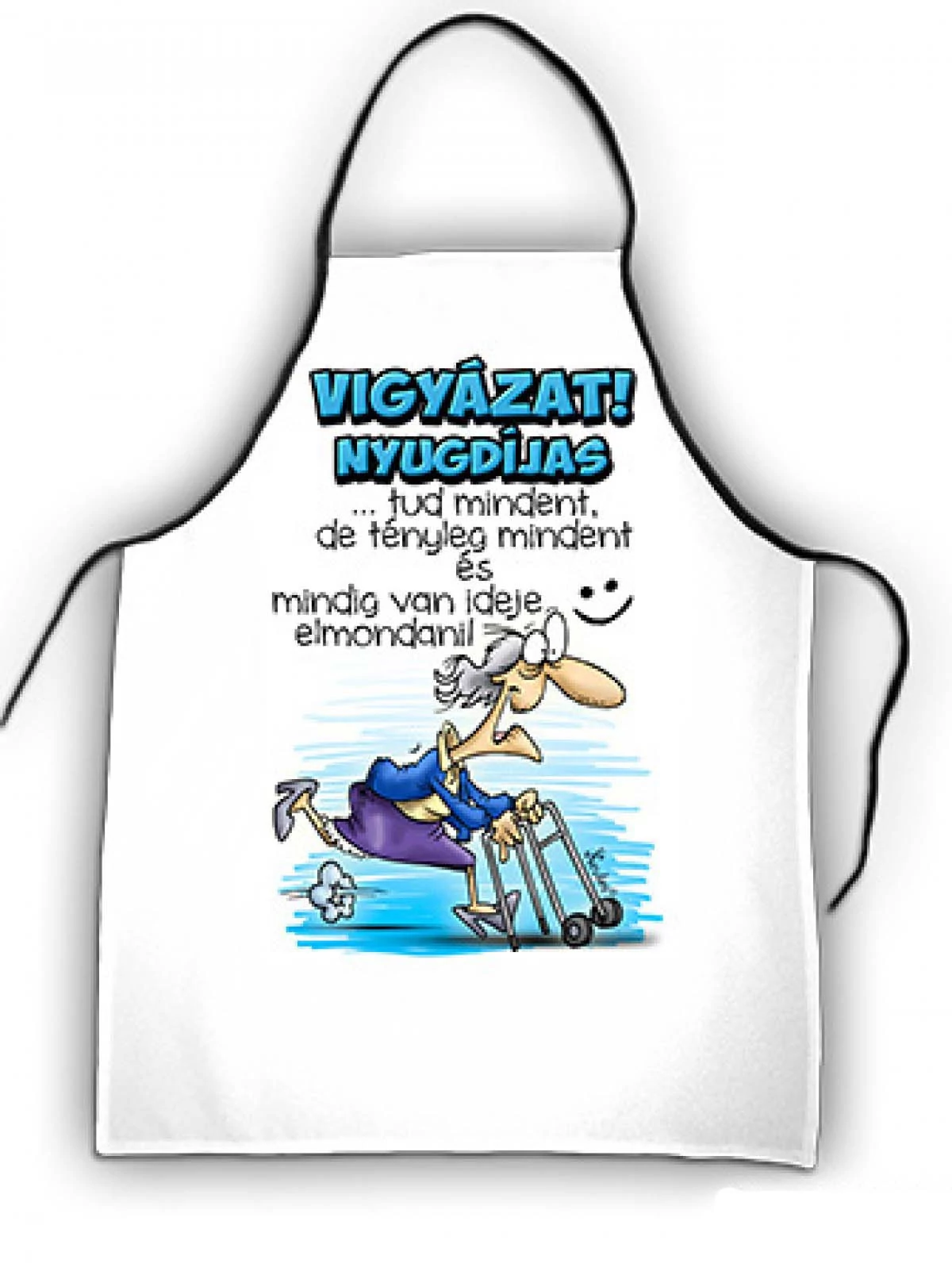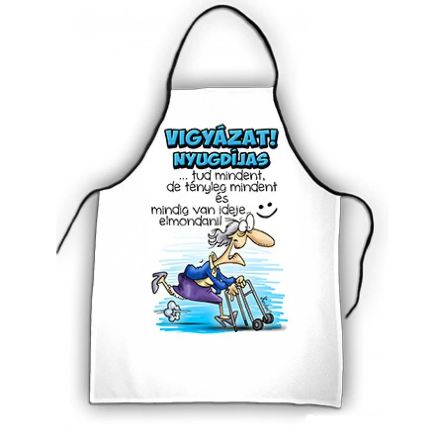 Kötény 50 cm x 70 cm - Vigyázat Nyugdíjas – Ajándék Nyugdíjasoknak