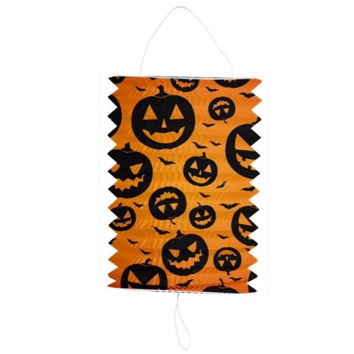 Tökös díszítésű, narancssárga-fekete lampion. 16 cm átmérőjű.