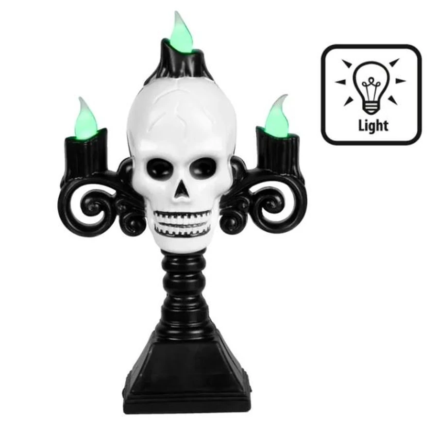 LED-es koponya gyertyákkal. Zöld fénnyel világít.
