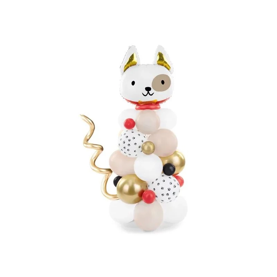 Lufi csokor Kutya, a készlet tartalma: lufi (34 db), fólia lufi (1 db), modellező lufi (4 db), papírszívószál (1 db), kétoldalú ragasztó (24 db) és 2,5 m léggömbfüzér szalag. Mérete kb. 83 x 155 cm.