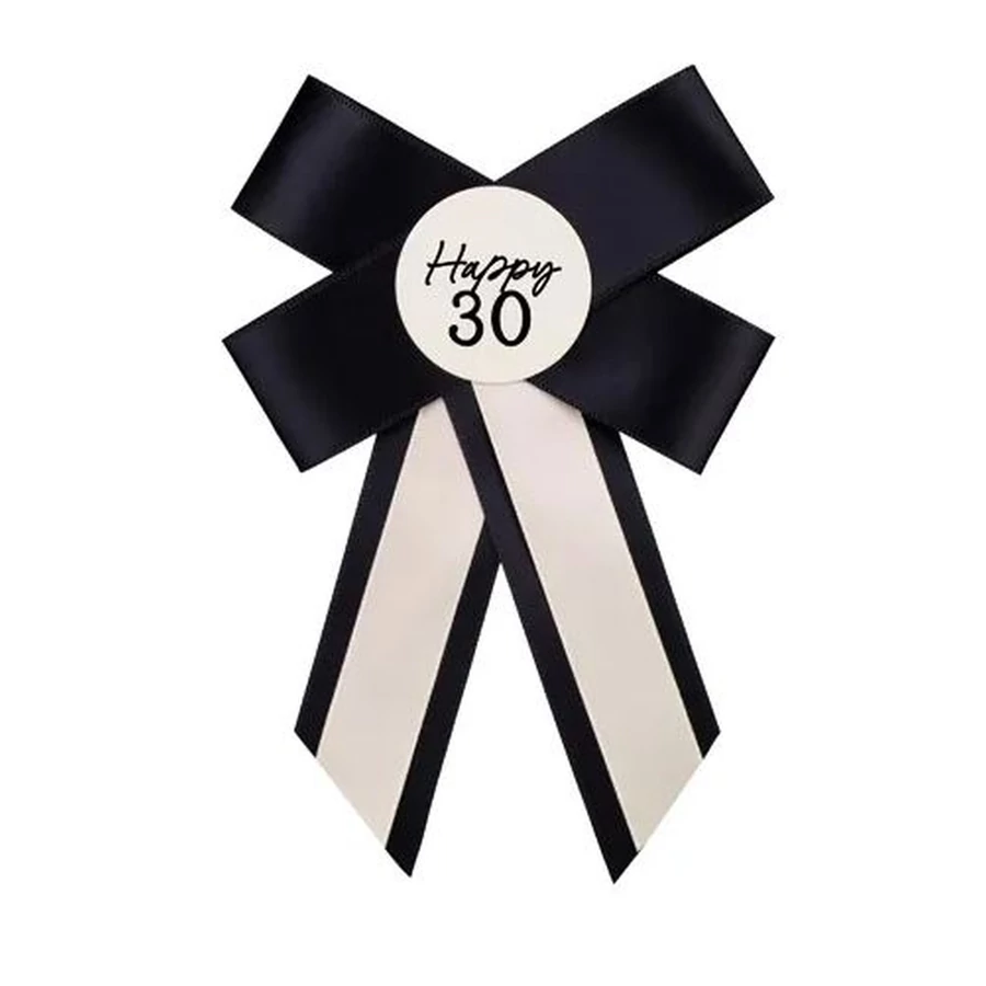 Fekete-fehér színű, masnis kitűző "Happy 30" felirattal.