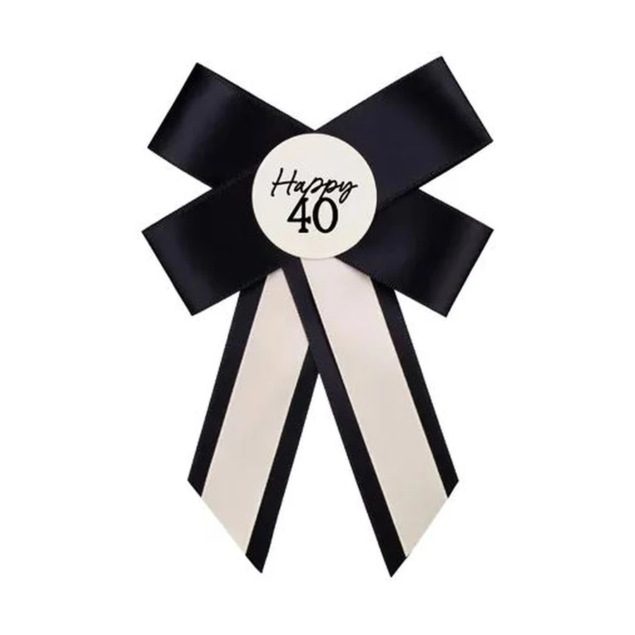 Masnis, fekete-fehér színű kitűző Happy 40 felirattal.
