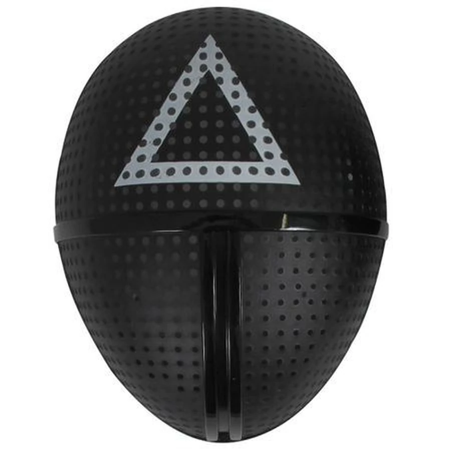 Ez az ikonikus maszk a népszerű "Squid Game" sorozatból ismert, és tökéletes választás cosplayhez, tematikus bulikhoz vagy akár Halloween jelmezekhez. A fekete maszk közepén található fehér háromszög minta a sorozat egyik legismertebb karakterére utal. A perforált felület biztosítja a kényelmes légzést és a megfelelő kilátást, így stílusos és praktikus viseletet biztosít.