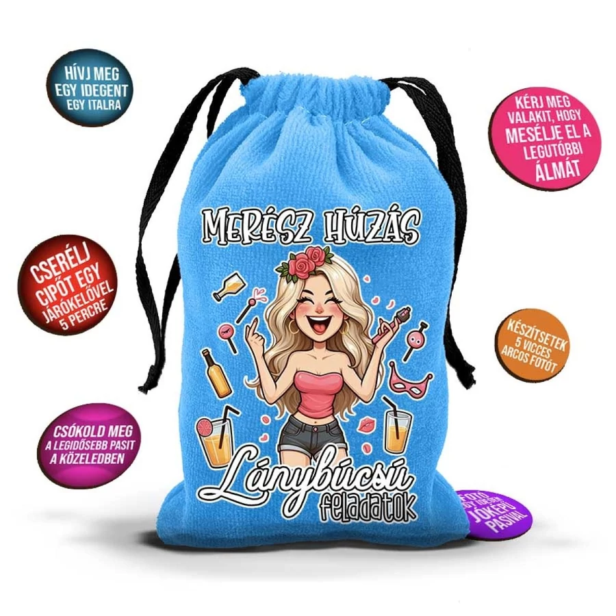 A plüss zsák és a fa zsetonok együttesen alkotnak egy olyan játékot, amely feldobja az estét és emlékezetessé teszi a lánybúcsút. Az egyedi méretű és dizájnú plüss zsák könnyen beilleszthető bármilyen buli vagy összejövetel hangulatába.