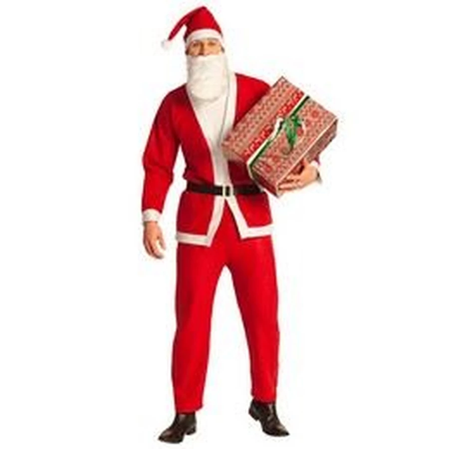 A jelmez tartalma: mikulás sapka, filc ruha és filc nadrág, fekete öv, gumisan rögízthető szakáll.