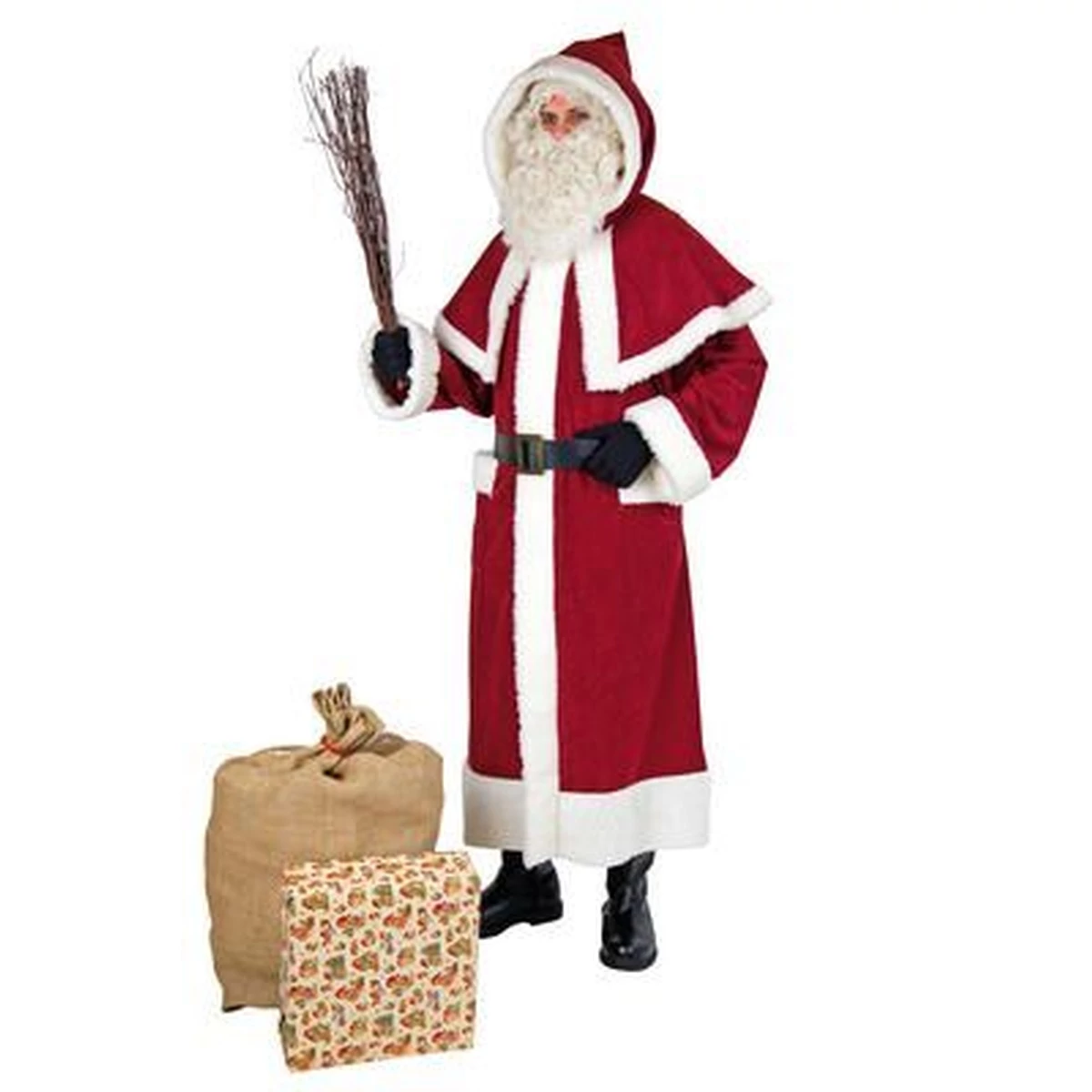 Mikulás kabát kapucnival vörös bársony anyagból , övvvel.