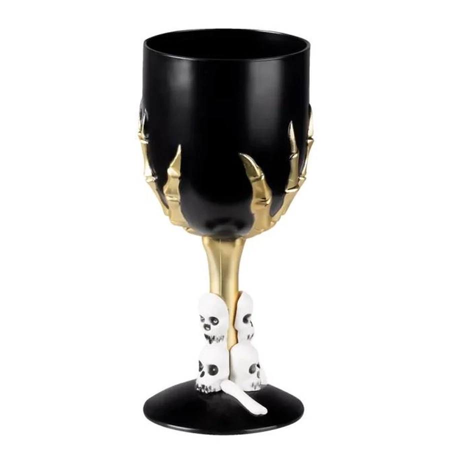 Műanyag, fekete színű borospohár, arany kézcsont szárral és koponya díszítéssel.