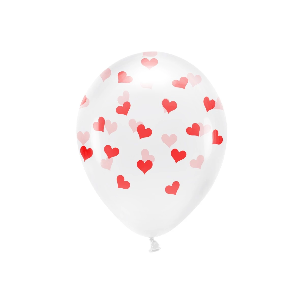 Átlátszó öko lufik, szívek, piros, ötoldalas nyomtatással, átmérője kb. 33 cm. (1 csomag / 6 db)