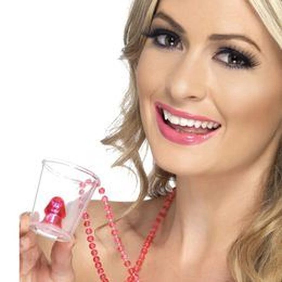 Nyakba akasztható , átlátszó, műanyag feles pohár rózsaszín füzéren, pénisszel a közepén.