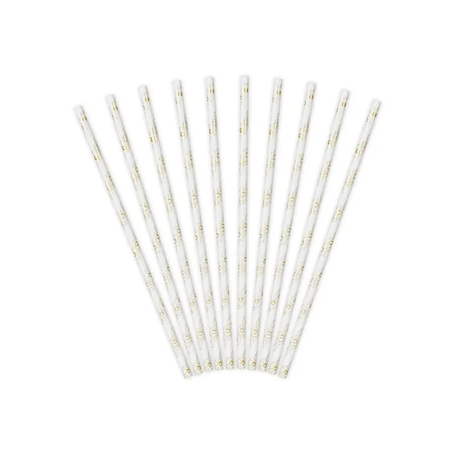 Papír szívószálak, fehér fémes arany margarétával, hossza kb. 19,5 cm.