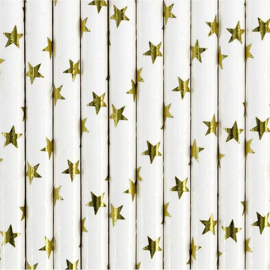 Papírszívószálak, fehér alapon, arany csillagokkal, hossza kb. 19,5 cm.