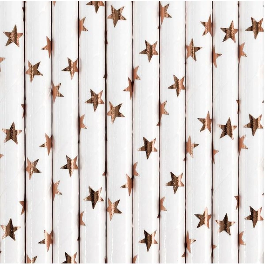 Papírszívószálak, fehér alapon, rosegold csillagokkal, hossza kb. 19,5 cm.
