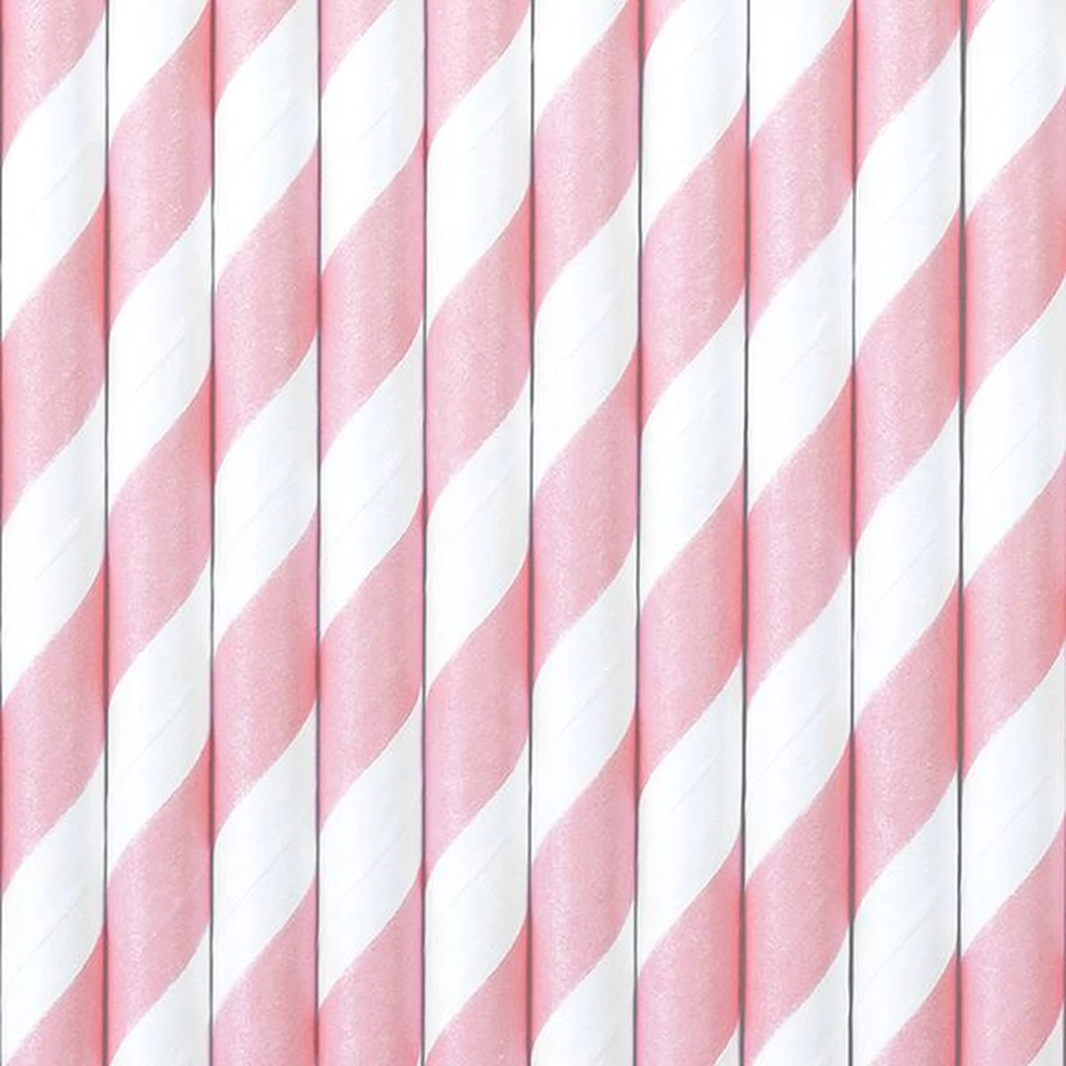 Papír szívószál, világos rózsaszín, ferde fehér csíkokkal, hossza kb. 19,5 centiméter. 10db/csomag